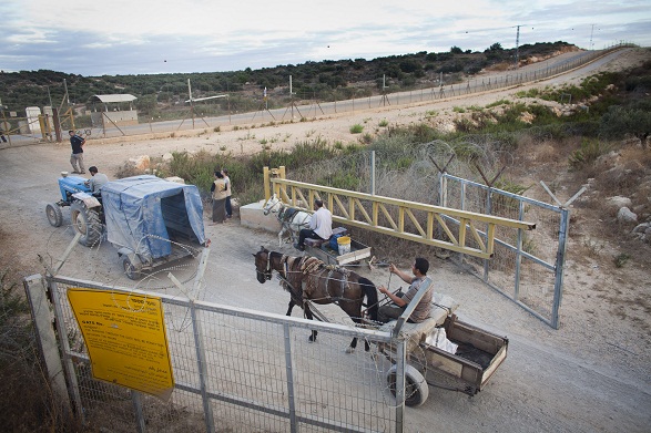 פלסטינים עוברים בשער חקלאי בכפר ג'יוס אל אדמות הכפר ש"במרחב התפר", ספטמבר 2012. צילום: אורן זיו, אקטיבסטילס