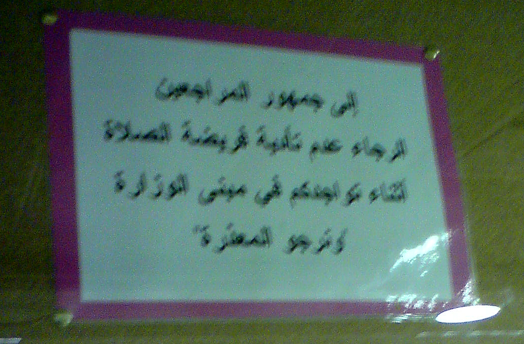 בתרגום לעברית (שאינו מופיע בשלט): לקהל המבקרים, בבקשה לא לקיים את חובת התפילה במהלך שהייתכם בבניין המשרד. ו"עמכם הסליחה". (צולם על ידי עובדת המוקד, פברואר 2010)
