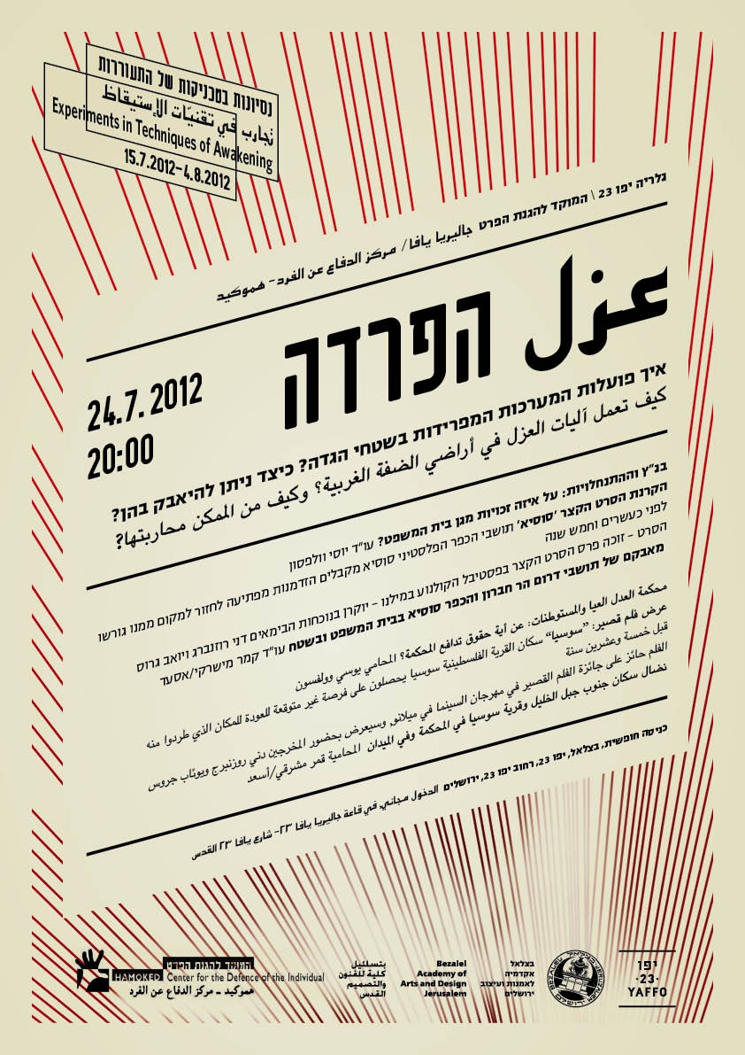 אירוע של המוקד להגנת הפרט וגלריה יפו 23 שייערך ביום שלישי 24.7.2012. הערב עוסק בנושא הפרדה: איך פועלות המערכות המפרידות בשטחי הגדה? כיצד ניתן להיאבק בהן? התכנית כוללת הרצאות של עו"ד יוסי וולפסון ועו"ד קמר מישרקי-אסעד והקרנת הסרט הקצר 'סוסיא' בנוכחות הבימאים דני רוזנברג ויואב גרוס.