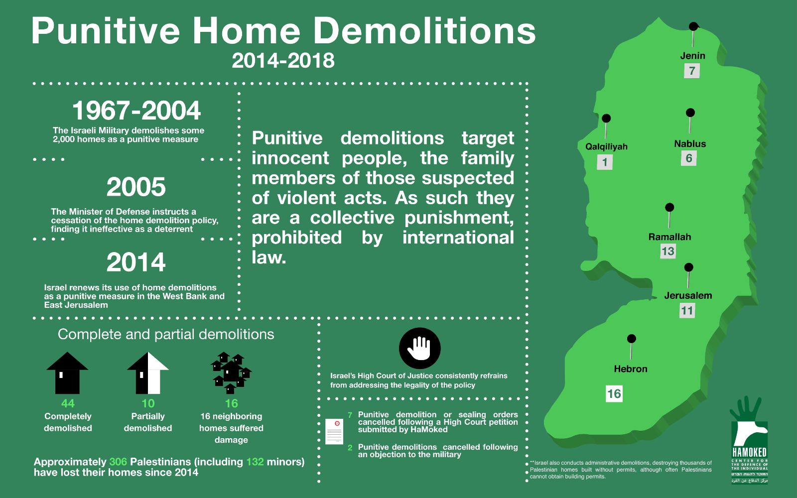 גם אליבא דישראל – מוטלת בספק גדול. הריסת הבתים אינה באה במקומה של ענישה פלילית אלא בנוסף לה, והנפגעים העיקריים ממנה הם דיירי הבית שנהרס, ולא האדם אשר לו מיוחסים המעשים, שעל פי רוב נכלא או נהרג. ברי, אם כן, כי הריסת בתים מהווה ענישה קולקטיבית, המנוגדת לדין הבינלאומי ולעקרון היסוד במשפט הישראלי, לפיו אין מענישים אדם בגין מעשים שלא ביצע.