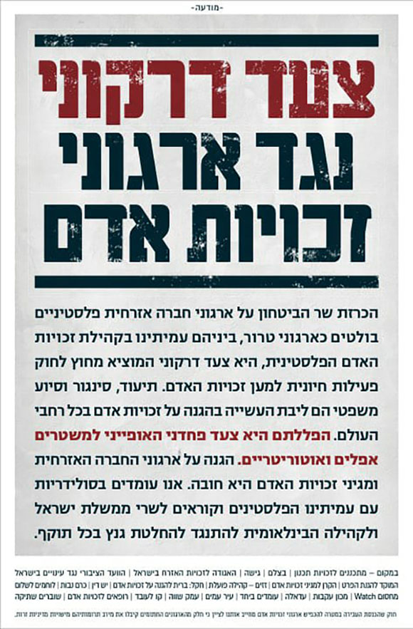 הכרזת שר הביטחון על ארגוני חברה אזרחית פלסטיניים בולטים כארגוני טרור, ביניהם עמיתינו בקהילת זכויות האדם הפלסטינית, היא צעד דרקוני המוציא מחוץ לחוק פעילות חיונית למען זכויות האדם. תיעוד, סינגור וסיוע משפטי הם ליבת העשייה בהגנה על זכויות אדם בכל רחבי העולם. הפללתם היא צעד פחדני האופייני למשטרים אפלים ואוטוריטריים. הגנה על ארגוני החברה האזרחית ומגיני זכויות האדם היא חובה. אנו עומדים בסולידריות עם עמיתינו הפלסטינים וקוראים לשרי ממשלת ישראל ולקהילה הבינלאומית להתנגד להחלטת גנץ בכל תוקף.